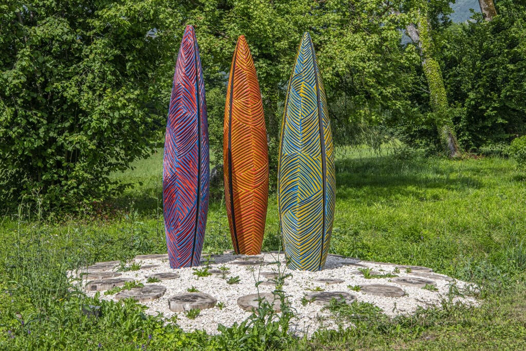 Mais n’est-ce pas là le propos même du Chant des sculptures que de proposer tous les aspects de la création contemporaine, à travers toutes les esthétiques et tous les matériaux ? En posant de surcroît la question de la genèse de l’œuvre. Ici, l’opportunité – la fourniture d’un séquoia – a déterminé la matière, qui a elle-même, en fonction des contraintes – éviter de couler un socle en béton –, généré les volumes et donc les formes.